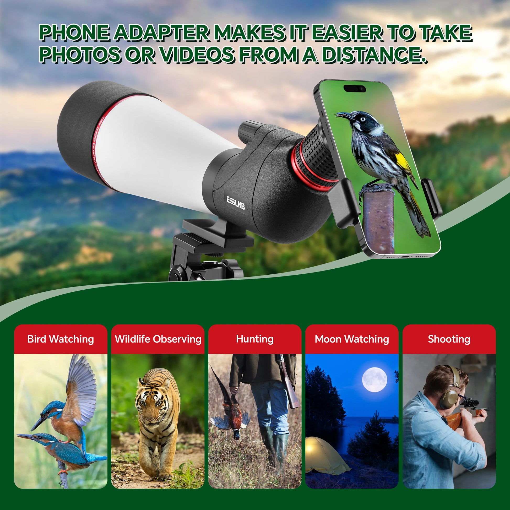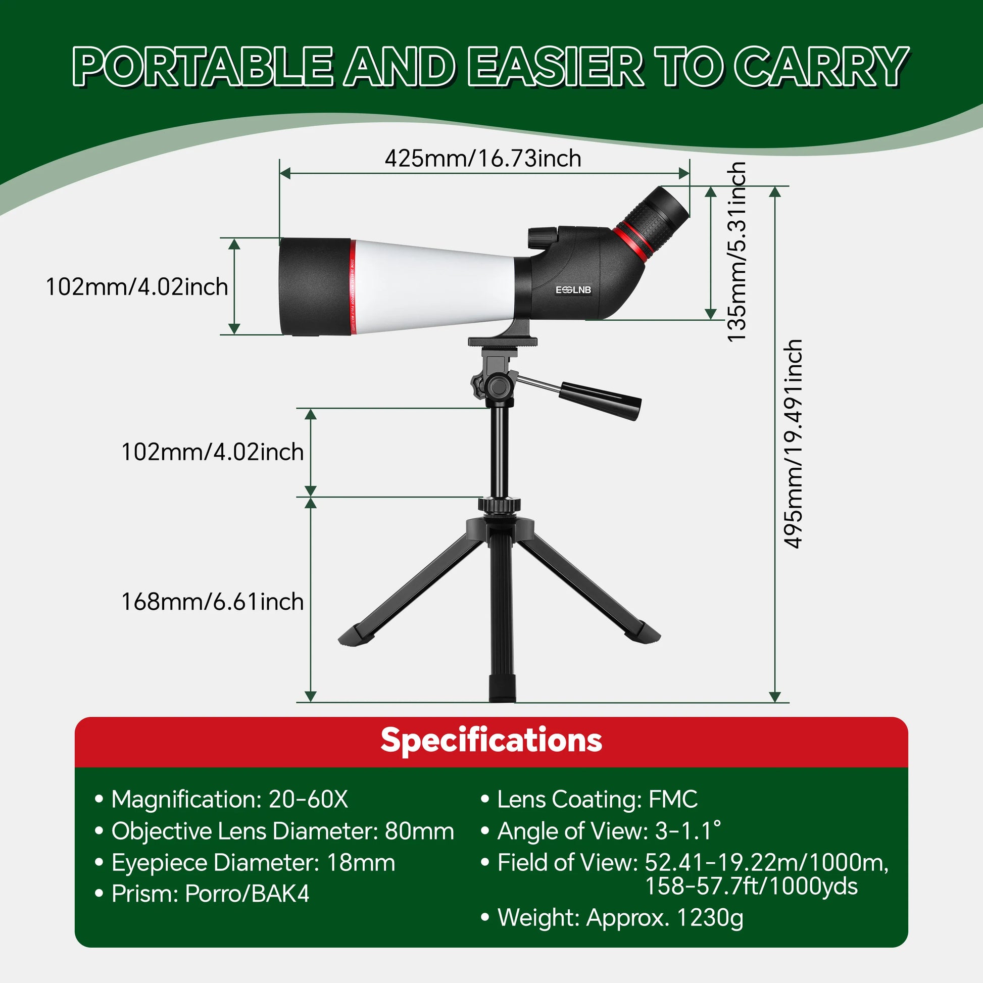 - 20–60X Magnification lets you enjoy sweeping vistas at the low end and close, intricate details at the high end; perfect for bird watching, wildlife, hunting, hiking, camping, and outdoor sports.