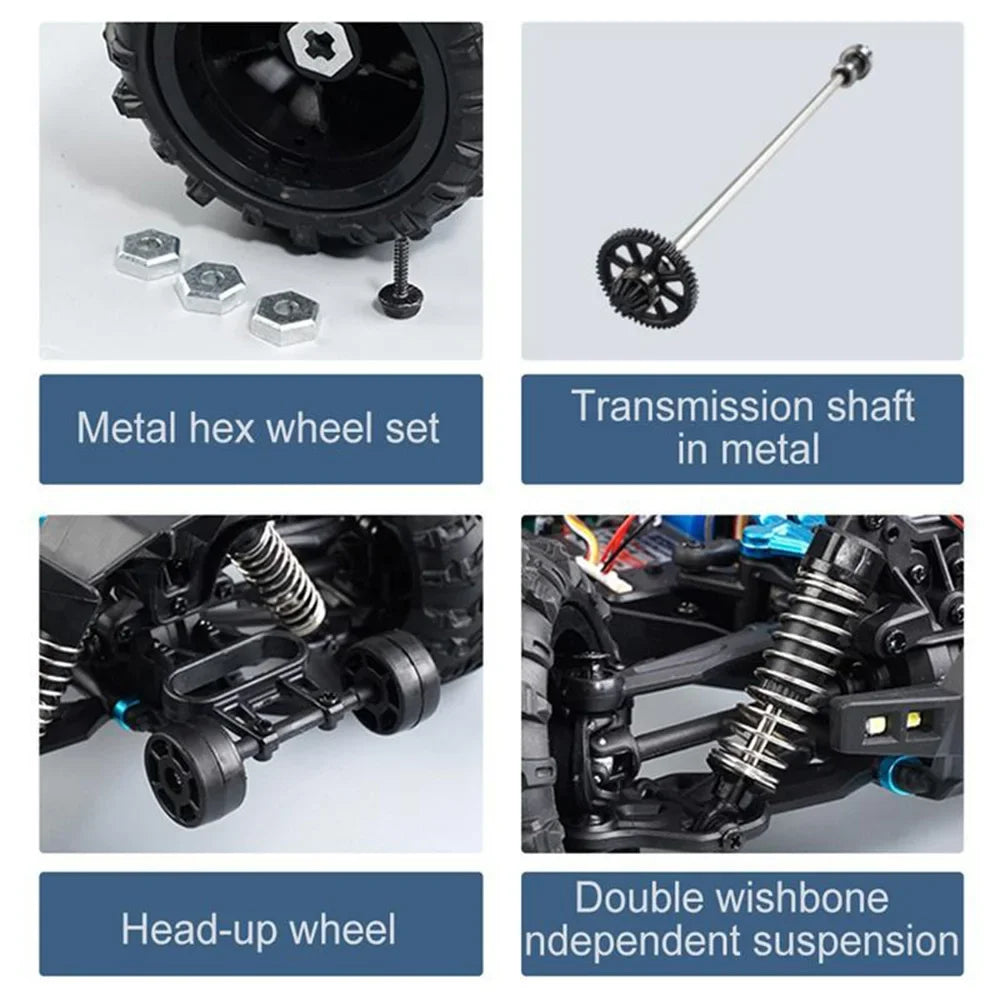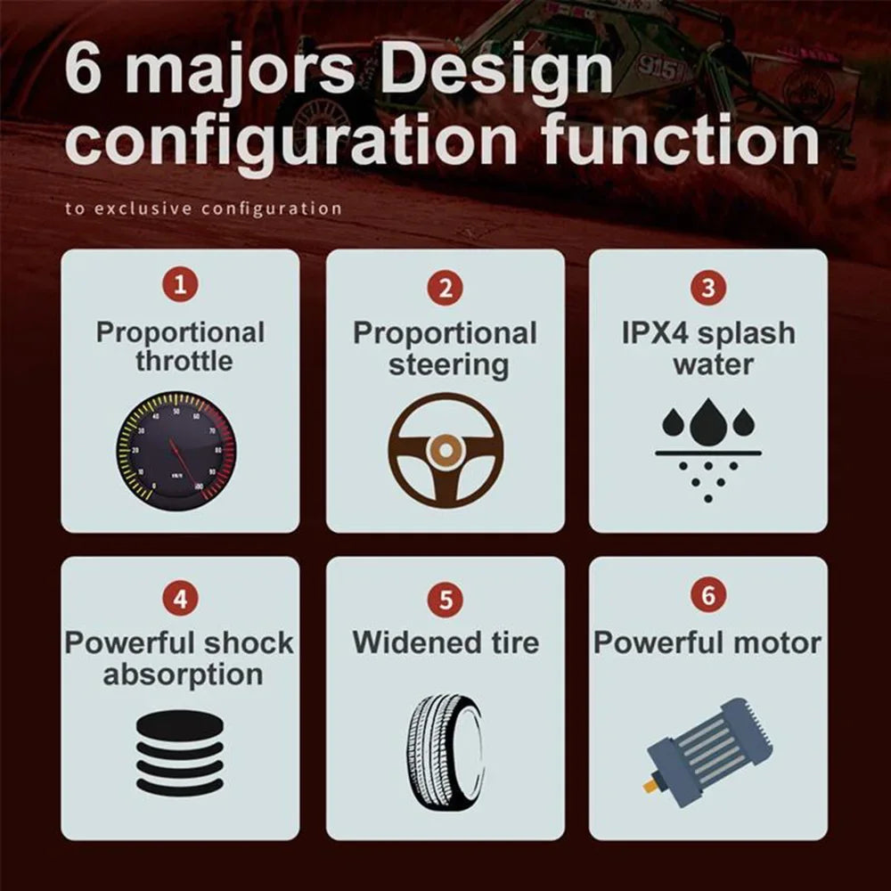 - You unleash high-speed torque with built-in motors driving a 4WD, waterproof chassis that handles rough terrain and hits up to 50 km/h on straightaways.